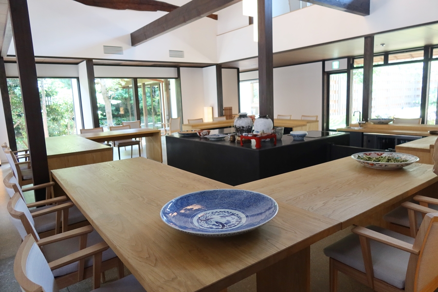 ダイニングは中央にあるカウンターを客席がロの字に囲むようになっており、あえて他の宿泊客と顔を合わせるような仕掛け。家庭的なおもてなしを受けるようなプライベート感がありながらも、ほどよい公共性も感じられる空間になっている。そして、ここで使われている食器の一部は堀内邸にあったもの。いくつか見せていただいたが、古九谷や染付の大皿など手の込んだ品も多く、器好きには楽しい食卓になりそうである。