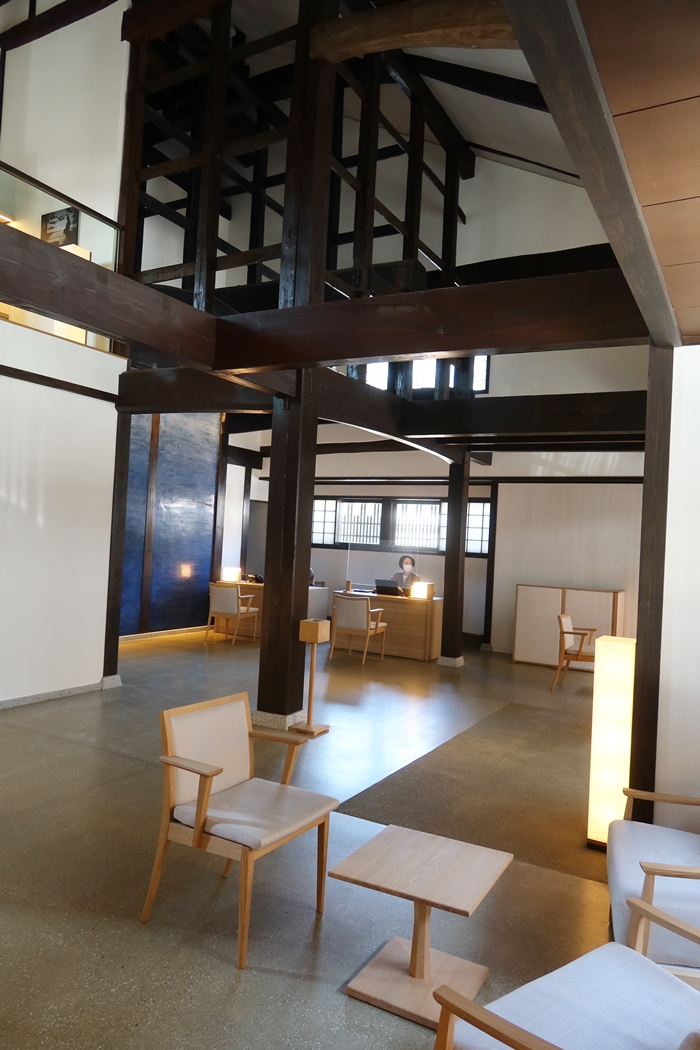 最後にそれぞれの建物を紹介しておこう。まずはAzumi Setoda。通りに面した建物はレセプション、ダイニングとして使われており、2階の床を抜いて最大では高さ9mもの吹き抜けとした大空間が圧倒的。太い柱、梁がもともとの建物の堅牢さを物語る。
