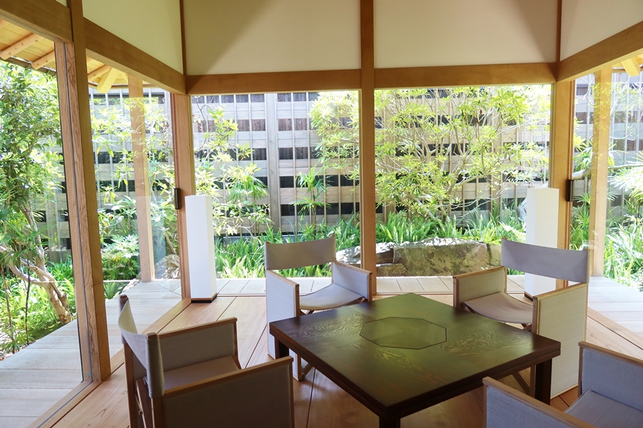 1階には個室と東屋があり、宿泊時などに可能であればぜひ、見ていただきたいのが東屋。美しい白木で作られた多目的に使える空間で、三方に開かれた窓からはダイニング前の庭とは異なる、シダ類などを中心にしたアジアンテイストの庭が広がる。茶会やヨガその他のイベントにも使われているそうだ。