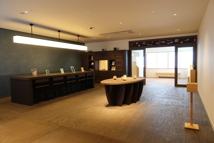 14室の客室のほか、2階には宿泊者が利用できるyuagariラウンジがあり、地元に関連した書籍や土産物として購入できる塩壺(!)などが展示されている。今時は見られないような欄間の彫り物も必見だ。