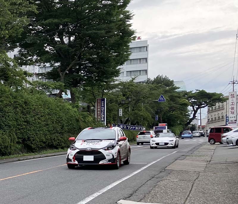 参加選手は、風情ある街並みを、温泉街をそぞろ歩く観光客に応援され、手を振りながら、カラフルなラッピングを行ったラリーカーで一般車に混じって賑やかに駆け抜けるのである。
