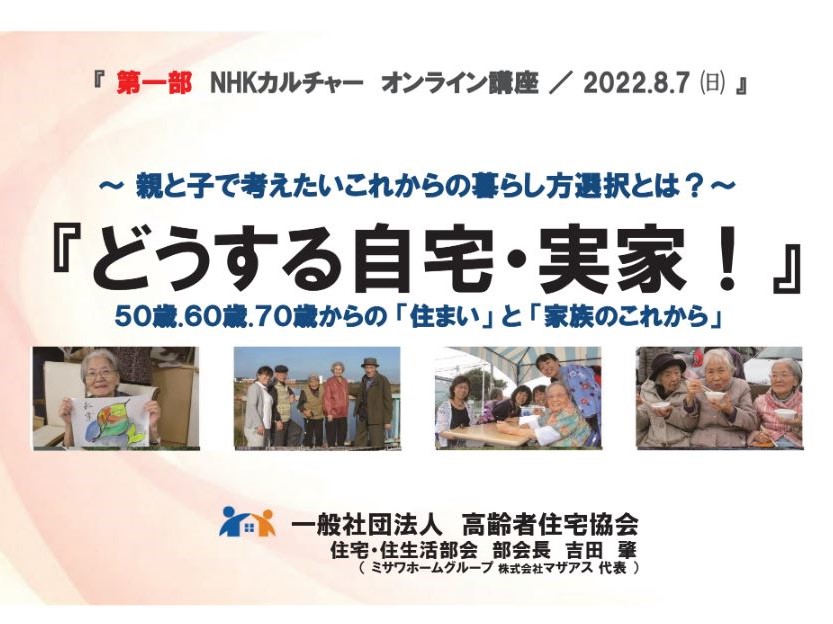 そんな人にとって役立つであろうオンラインセミナー『親と子で考えたい、どうする自宅・実家』が、2022年8月7日にNHK文化センター主催で行われた。講師として登壇したのは、一般社団法人高齢者住宅協会の吉田肇氏。ミサワホームグループの株式会社マザアス代表として、高齢者の住生活や高齢者住宅の住空間のあり方に関する調査研究、提言等を行ってきた実績がある。高齢期の住まいについて、どのような課題があり個人はどのように備えるべきであろうか。日本の現状をもとにセミナーの内容を紹介したい。