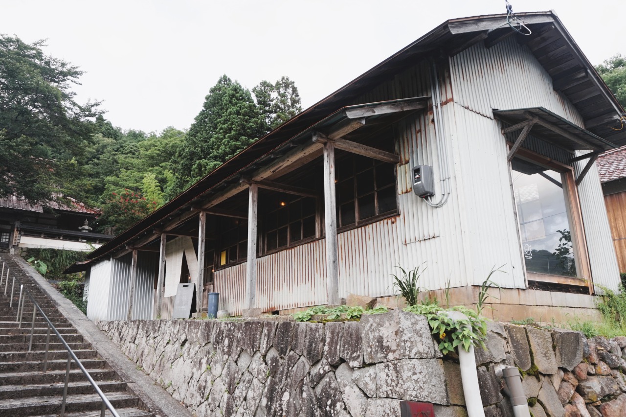 さて、日貫にたどり着き、川を渡った先にある宝光寺というお寺の入り口に車を停めた。参道の階段があり、その脇には大きな窓が特徴的な小屋がある。廃材を活用した建物だ。「一揖」(いちゆう)という名前の「日貫一日」の建物の一つで、宿の鍵を受け取るフロント機能を担っていて、カフェとギャラリーも併設している。