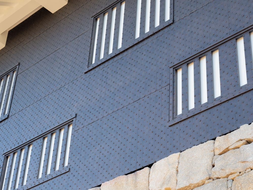 短冊型をした鉄板の大きさは、およそ横11cm・縦130cmだという。鉄板は上下に重ねる「羽重ね」という留め方で、丸い鋲頭(びょうとう)が付いた鉄釘で固定されていた。渡邉さんによると「市民の方々から焼失前の写真や、貴重な焼けた鉄板を寄付していただき、当時の鉄板の調査・検証なども行いました。それを基に、鉄板の質感やさびた感じをエイジング加工で再現。鉄釘の丸い鋲頭なども再現しています。素材の鉄は、地元の製鉄企業に寄付していただきました」。さきほど紹介したように、鉄板の裏には、寄付者の名前が記されている。まさに市と地元企業、地元住民、福山城が好きな全国の方々の協力によって、往時の福山城の姿がよみがえったといえる。
