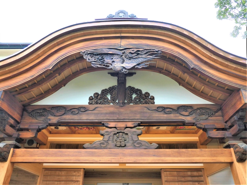 こうして安養院の玄関屋根へと生まれ変った、「キングオブ銭湯」の唐破風。「ぜひ、全体の姿を見ていただきたいです」と、内藤住職。あらためて眺めてみると、唐破風のまろやかな曲線、鳳凰(ほうおう)の彫刻、大黒天の彫刻など、ひとつひとつ、見応えがある。