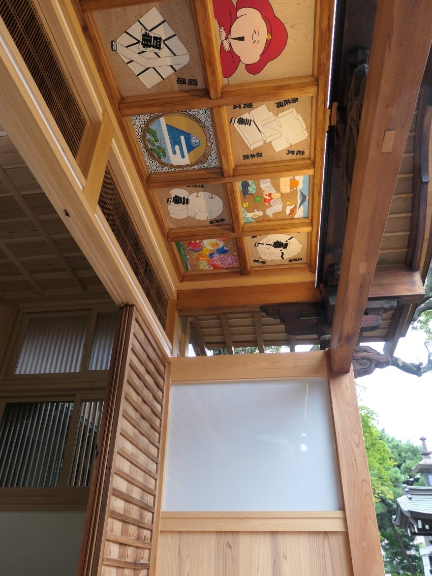 玄関正面に立ち、天井部分を見てみると、太い角材が格子状に組まれており、12枚の絵がはめ込まれていることに気づく。大黒湯の唐破風の移築に合わせて、安養院玄関に新たに施した格天井(ごうてんじょう)だ。12枚の絵は、移築保存プロジェクトを応援してくれた人たちから奉納されたものという。奉納者は、足立区のとび職(江戸消防記念会十一区)、庶民文化研究家の町田忍さん、千住在住のイラストレーターのなかだえりさんと緒方綾乃さん、そして安養院関係者だ。町田忍さんは銭湯研究で知られ、大黒湯の愛称「キングオブ銭湯」の名付け親でもある。