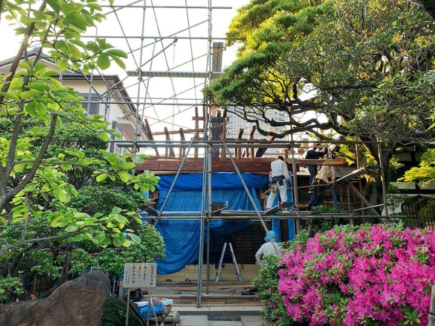 さて、安養院へ移築保存されることが決まった大黒湯の唐破風。2022年2月下旬には大黒湯から唐破風が取りはずされ、移築に向けて工事が始まった。寺の既存の玄関に、銭湯の建物にあった唐破風を取り付けるという、高い技術を要する工事だが、安養院とは長い付き合いで銭湯の建築実績もある西工務店(足立区)が工事を担うことになった。