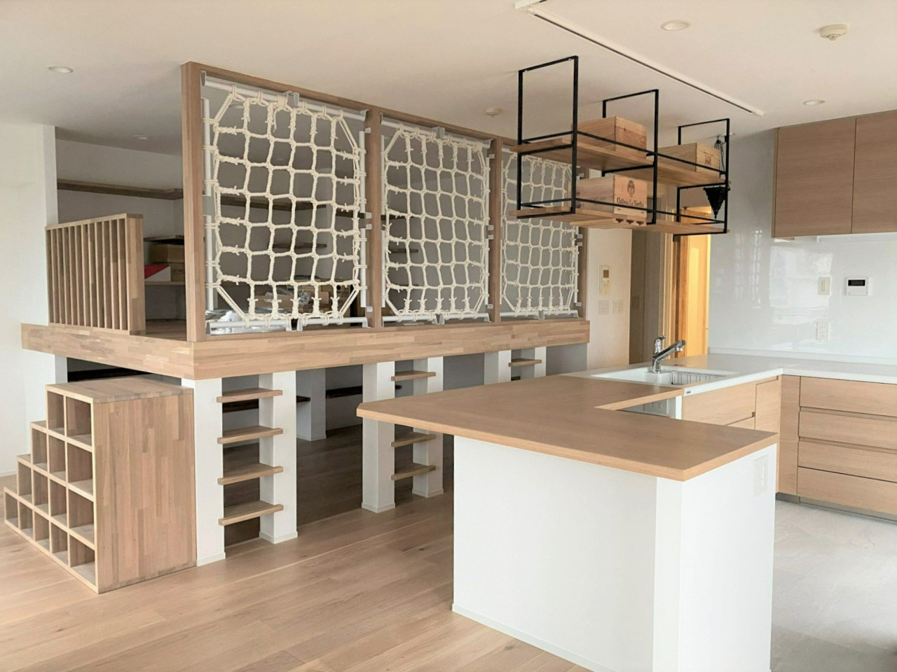 テーブルの先には小上がりも作られており、小さな子どものいる施主家族にはいろいろ使い勝手も良さそう。といっていかにも畳という空間ではないあたりがこの人たちのスタイルなのだろうなと自然に寛ぐご家族のエントリー写真を見ていて感じた。