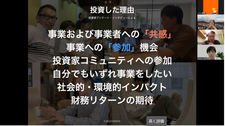 実際にファンドに投資した人たちからは、事業に参加できる機会を得られることへの評価が高いとか。「金銭的リターンへの期待もなくはないが、実はそう大きくはないという点が面白いと思います」と福田氏はファンドの特徴を分析する。