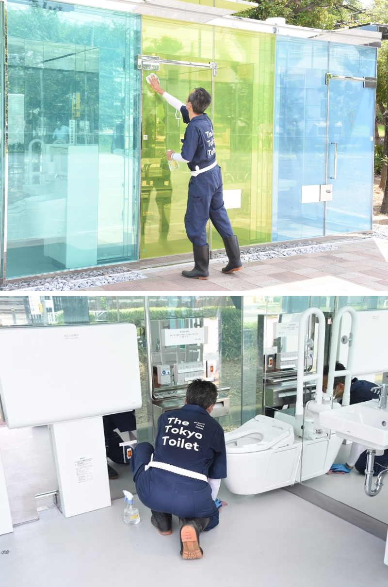 まず、日々の清掃。渋谷区の公共トイレは、通常、1日1回の清掃で、水洗いとブラシがけを主とする湿式清掃を行っている。それに対し、「THE TOKYO TOILET」のトイレでは清掃は1日に2~3回。各回で乾拭き中心の乾式清掃を実施し、床や壁、便器などそれぞれの場所の汚れや、材質に応じて専用の除菌・消臭剤とダスターを使い、手作業で清掃を行っている。乾式清掃は水を使わないので、乾燥した状態で清潔感を保ちやすくなるという利点がある一方で、清掃にかかる手間は湿式清掃に比べて倍以上かかるという。