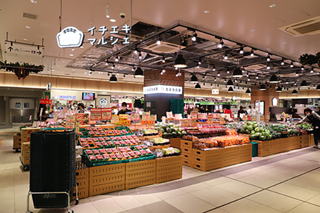 「まいにち。よりみち。マーケット」をコンセプトに掲げ、精肉、青果、鮮魚の生鮮品や日用品の品揃えを充実。10月19日には、東海エリア初出店の精肉店「タカギフーズ」のほか、いずれも一宮市初出店となる青果店「カネ井青果」鮮魚店「魚喜」豆腐の工場直売所「とうふや豆蔵」が並ぶ生鮮品売り場「イチエキマルシェ」が全面開業した。