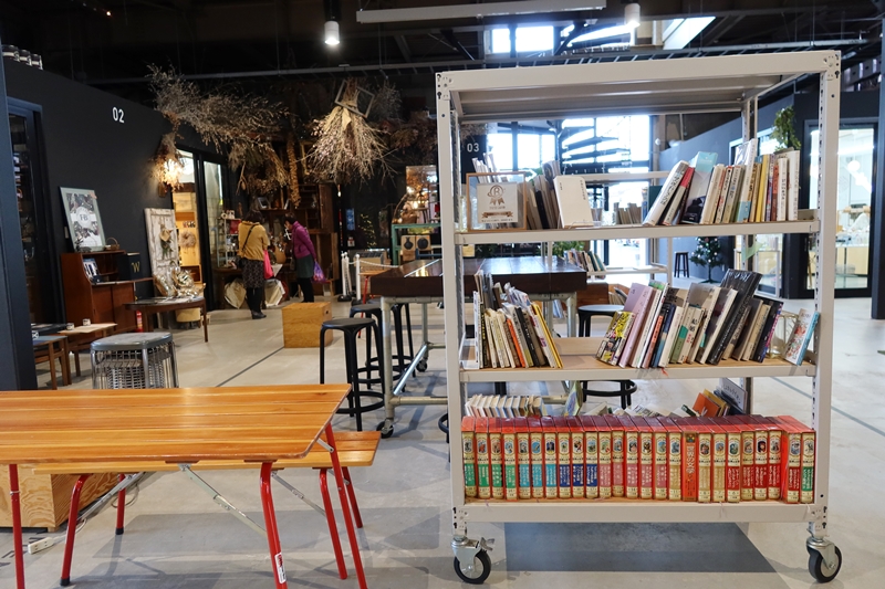 そして、この公園的なスペースがヤマキウ南倉庫の魅力のひとつ。民間の複合施設ながら誰もが出入りできる、ある種のパブリックスペースなのである。中央には机と椅子、本棚が置かれているのでそこに座って本を読む、同行の人とおしゃべりをするなど好きに過ごすことができる。また、ときにはレンタルスペースとしてセミナーや講演会、展示会などに使われてもいるそうだ。