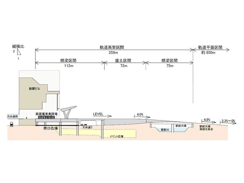 また、路面電車のルートが変わるのも大きな変更点である。現在、路面電車の南口広場への侵入ルートは迂回している。そのため広島駅と紙屋町・八丁堀地区間の所要時間が長く、路面電車の定時制や速達性の確保が課題であった。そこで駅ビルを活用して、路面電車の進入ルートを高架化。さらに短絡ルートとなる駅前大通リに、新たに路面電車のルートを新設する。