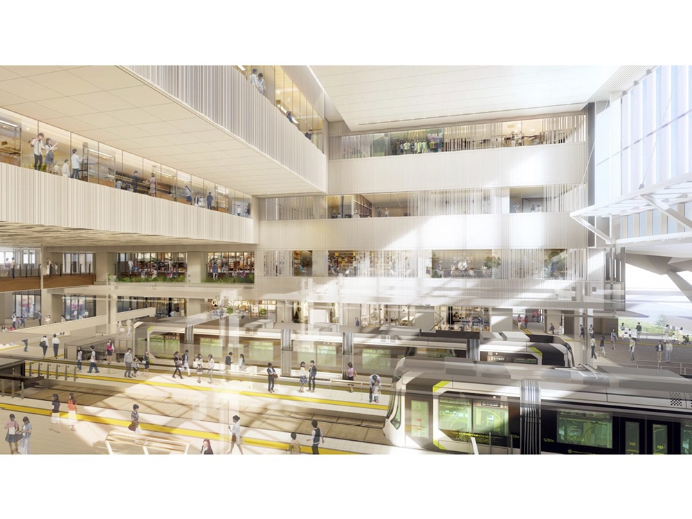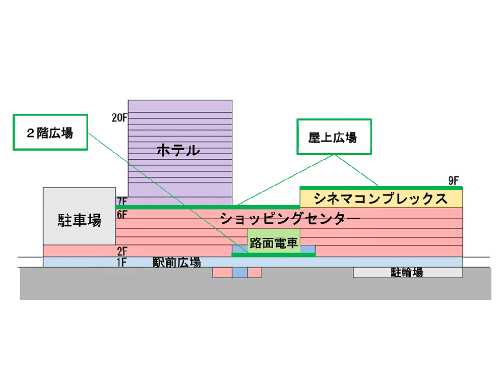 駅の改札のある2階には、新たに乗り入れる路面電車の乗り場を設置。そして6階まではショッピングセンターのエリアとなる。7・8階にはシネマコンプレックス、また7〜20階にはホテルも入る予定だ。さらに7階と9階には屋上広場を設置し、憩いの空間となる。