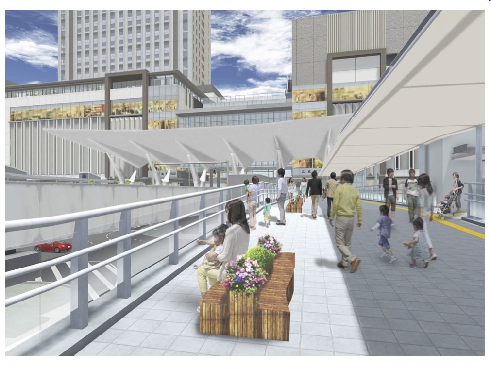 「ちなみに広島駅の北口には、すでにペデストリアンデッキが設置されています。南口のペデストリアンデッキがイメージしにくい方は、実際に北口のペデストリアンデッキを歩いてみてください」と田原さん。