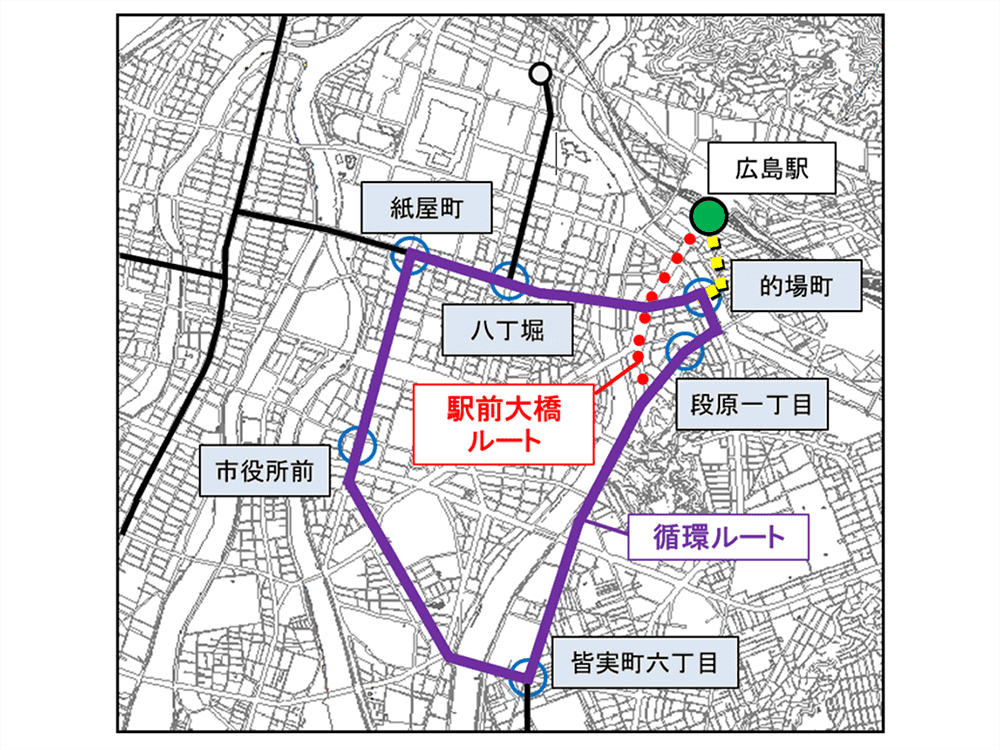 新しいルートは、既存のルートから分岐して駅前大通りを通り、広島駅へ南側から真っ直ぐと進入する。あわせて既存ルートの猿猴川から広島駅のあいだのルートは廃止され、「循環ルート」に再編される。新設ルートは新駅ビル2階へ乗り入れるために、猿猴川にかかる駅前大橋の南詰から高架になる計画だ。