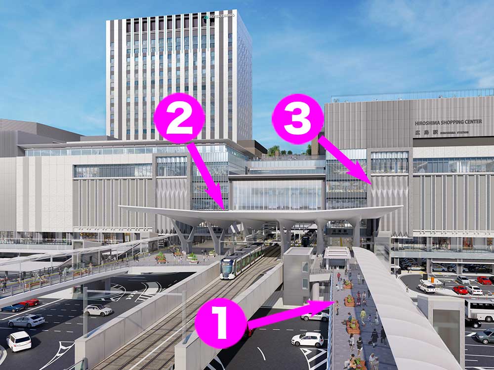 広島駅南口の再開発の中で、とくに大きな変更となるのが広島電鉄の路面電車である。2023年時点で南口1階の広場にある路面電車の乗降場が、新しくできる駅ビル内の2階に新設される。