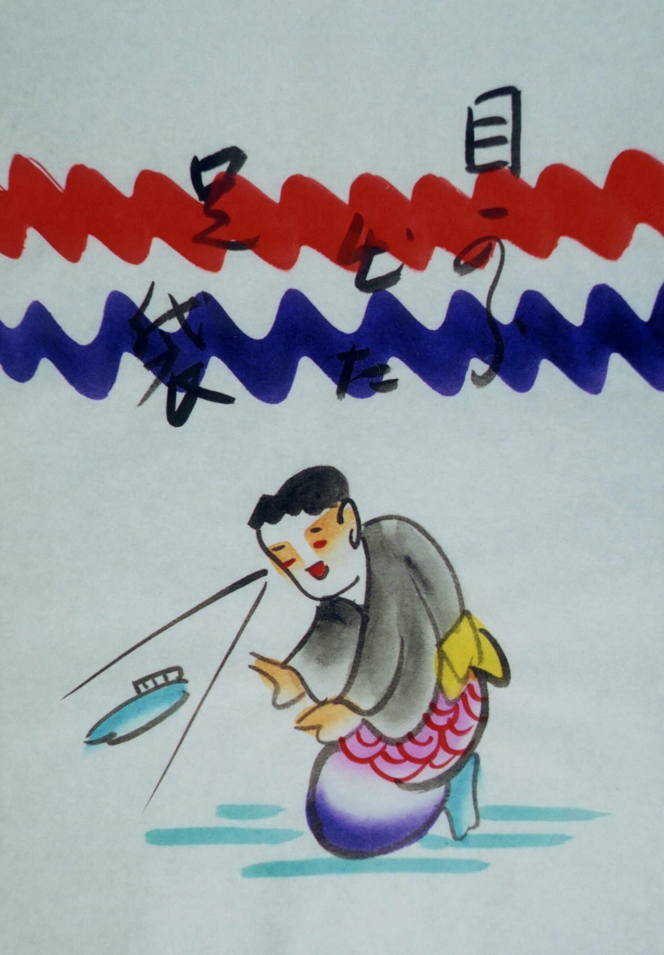 描かれているのは「目から出た足袋(めからでたたび)」。昔の文字が少々難しいので足立区立郷土博物館から発行の図録「地口行灯の世界」と見比べながら考える。元になっていることわざがおわかりだろうか。