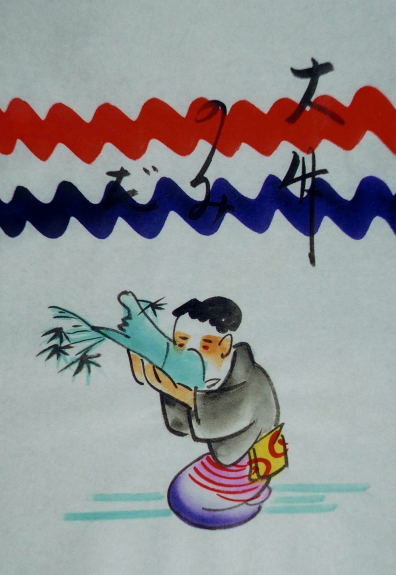 神輿同様、千住に江戸時代から継承されている文化のひとつが「地口行灯」だ。地口行灯は「じぐちあんどん」と読む。地口とは言葉遊びのことで「だじゃれ」のようなもの。祭りのときなどに軒先などに飾られる行灯で、地口(だじゃれ)にユニークな絵が添えられた工芸品だ。千住に継承されている地口行灯の絵は164種類あって、これらをひとつひとつ眺めていると江戸時代の人のさりげないユーモアが感じられ、当時のまちなかでくりひろげられた日常の笑い、会話がふっとよみがえる気がする。テレビも雑誌も動画共有サイトもなかった時代、ささいな会話の中に小さなウィットを交じえて楽しんだのだろう。ひとつ見てみよう。