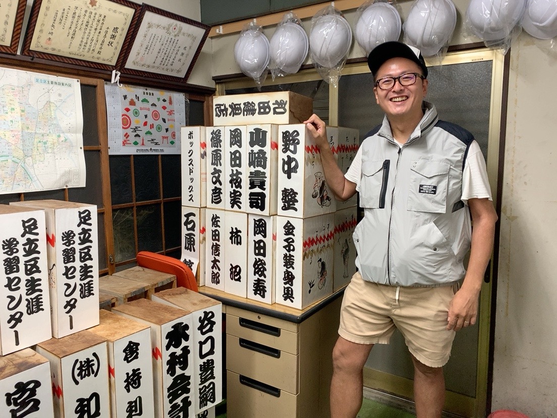 2023年の宵宮を主催する千住本町五町会宵宮連合も、今年始まるプロジェクトに協力している。同連合五丁目代表幹事で、神輿の会である千五睦副会長の山﨑功司さんは、「次世代に残したいという思いで五丁目では継続して飾ってきたので、今回の話は純粋にうれしかった。五丁目から続いて四丁目三丁目二丁目一丁目と、毎年この時期に地口行灯がたくさん並んだら圧巻だろうと思うし、宵宮で旧道を神輿が進むときに両側にあんどんがあったらいいだろうなあ」と話す。