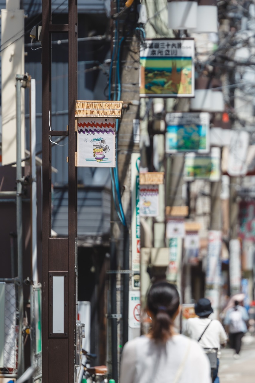 その名も「地口あんどんプロジェクト」。江戸時代宿場町だった旧日光街道(千住1〜5丁目)に地口行灯を100個とりつけるというプロジェクトだ。100個という数にしたのは、継承されてきた164種の地口絵すべてを千住のまちに飾りたいという思いからだという。1つの行灯には2枚の地口絵を貼るので、100個の行灯には200枚の地口絵を用いる。
