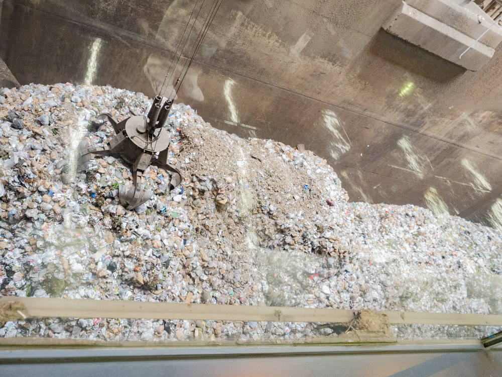 ごみ処理の設備の中でも、一番の目玉となるのがごみピットだろう。広大なピット内には、大量のごみが溜まっている。そして2台の巨大なクレーンが稼働する。ごみピットの大きさは、幅44m・奥行16m・深さ15m。4階建てのビルの高さとほぼ同じだ。最大で4,200トンのごみを溜められるという。