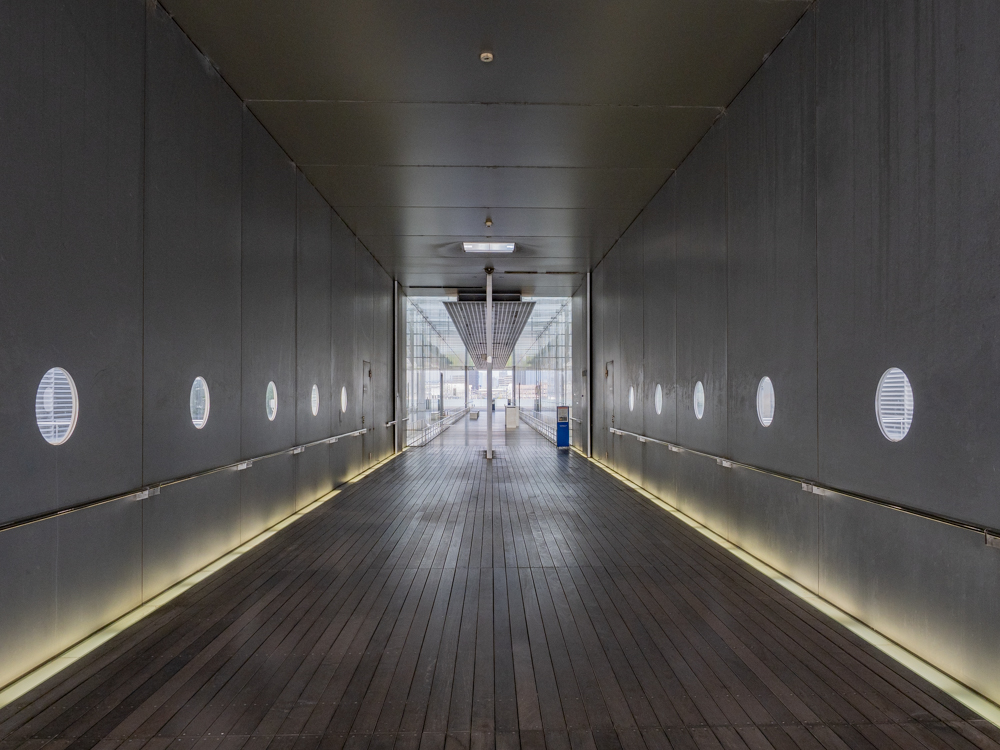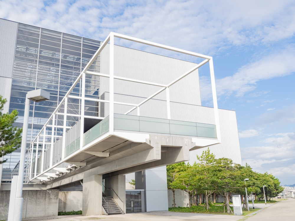 見どころは大迫力の吹抜け通路「エコリアム」と海辺の公園「エコアシス」