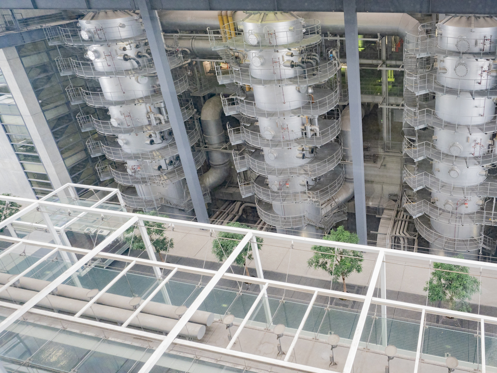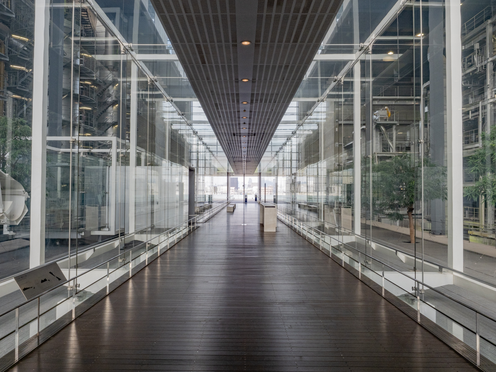 エコリアムは2階にあり、足を踏み入れると通路の左右のガラス越しに巨大な設備が立ち並ぶ。まるで未来都市のようなSF感あふれる雰囲気だ。そして海に向かって工場内を真っ直ぐと延びる通路は、開放感がある。なんとエコリアムは、結婚式の前撮りに利用される方も多いそうだ。さらにバス会社等によるバスツアーの目的地のひとつとして、エコリアムが組み込まれていることもあるという。