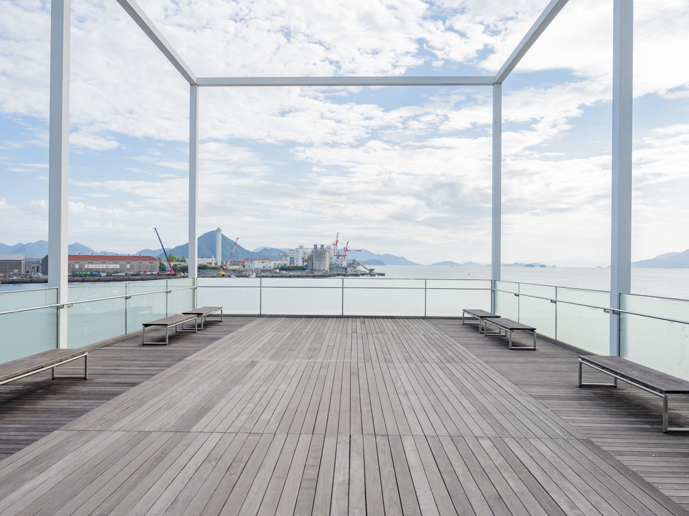 エコリアムを通り抜けると展望デッキに出る。デッキの目の前には、一面に広島湾が広がっており、見はらしが抜群だ。「晴れた日の夕方には、美しい景観が楽しめます」と惣本さん。