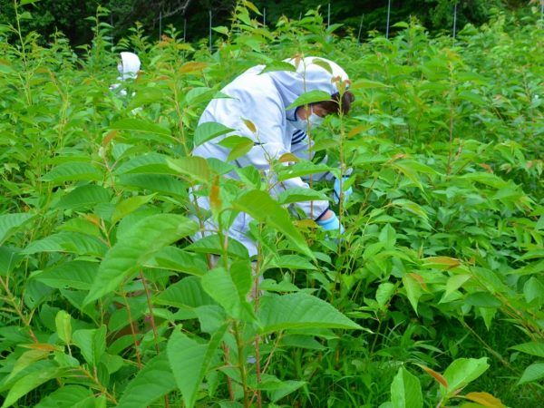 「大島桜は生長が早く繁殖力が高いので、北海道以外の日本全国で栽培できます。苗木を植えて3年ほどで収穫でき、収穫期が5~8月までと長期間にわたるのも特徴です。毎年、落葉した後は根元30cmほどまで剪定し、春に新しく伸びた新枝の葉を摘むので、収穫時の樹の高さは身長ほどですね」