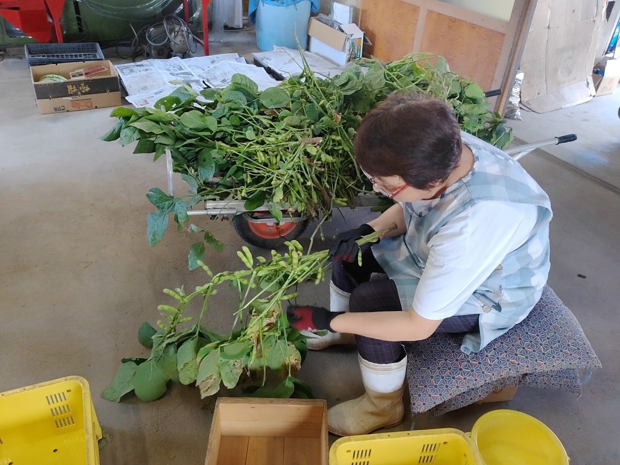 「ふる里」では農家のおばあちゃんが食事などの世話をしていて、夕食には畑で栽培された枝豆が食べ放題で出される。甘みがあっておいしい。翌朝には枝豆の収穫体験ができる。納屋の中に朝採れ枝豆の束が泥まみれのまま山盛りに置かれ、そこから商品にするため枝豆本体をもぎっていく作業だ。枝豆をもぎってA級品、B級品と仕分けしてカゴに入れ、さらに見た目が悪いものは自家消費分として別にする。A級品は農協へ、B級品は道の駅にアウトレットとして安く販売され、自家消費は宿泊者に食べ放題として供されるものだ。ちなみに虫で傷んだ枝豆は廃棄処分になる。A級品は全体の半分もないことに驚く。体験を通して、このように手間をかけて収穫しているのが実感として理解できる。