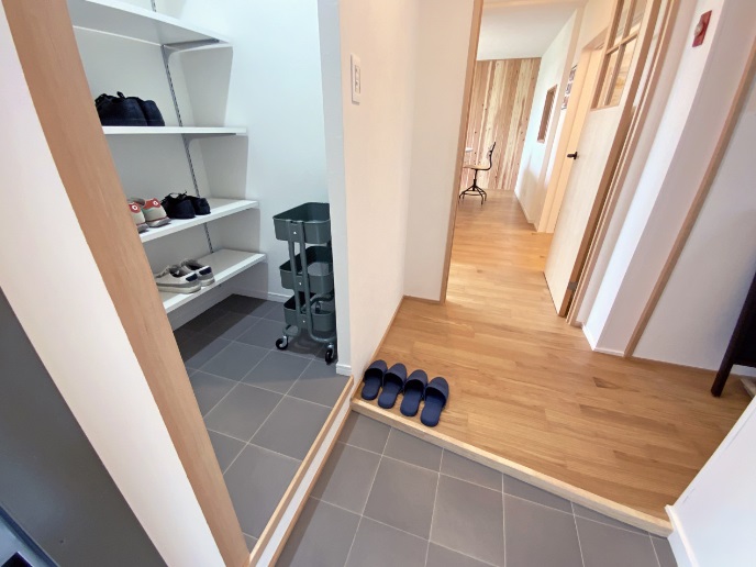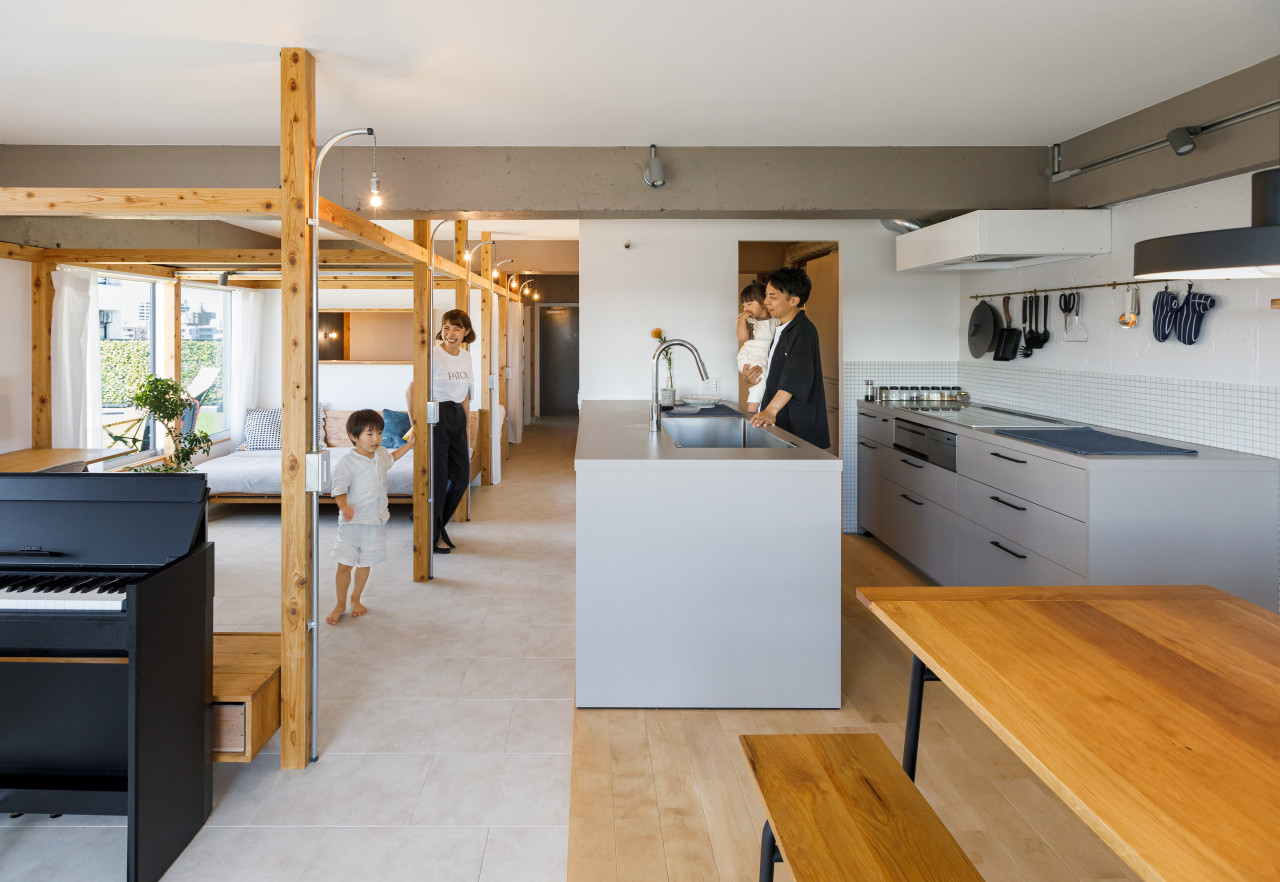 同作品では壁の断熱改修を実施、冬でも暖房無しで過ごせる日があるほどに暖かな住まいとした。加えて玄関と水回りの面積を1.5倍に拡大。それによって収納のなかった玄関に収納、ベビーカーのおける空間を確保、水回りには脱衣所、室内干し空間を作った。回遊性の高いキッチンも団地では珍しいところ。