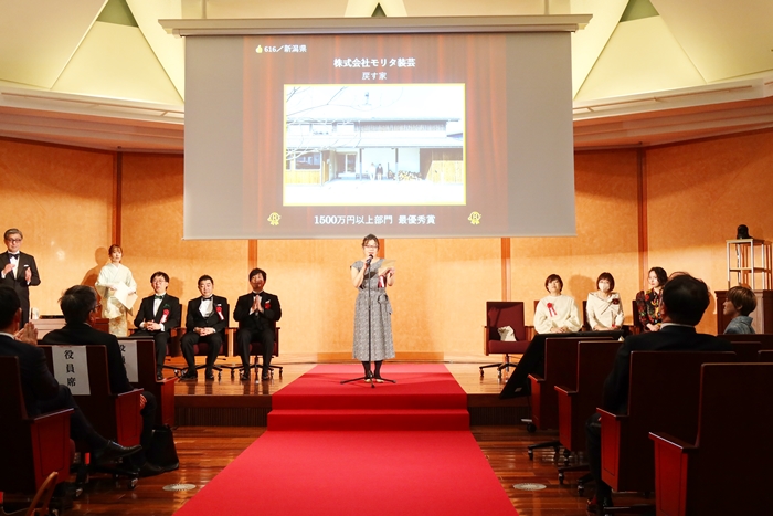 当然、そのうちからいくつか、受賞作品が出ている。たとえばずばり1500万円以上部門で最優秀賞を受賞したのは新潟県長岡市の築125年という古民家の改修「戻す家」(株式会社モリタ装芸)。半年ほど探し回って見つけた住宅は外部はぼろぼろで廃墟のようだったものの、豪雪地帯で時代を生き抜いた柱と梁は見事の一言。