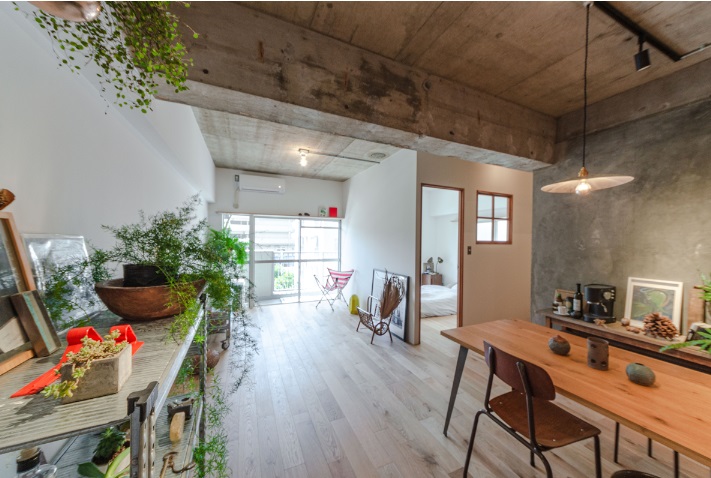 元々は入ったところにダイニングと水回り、バルコニー側に2室というよくある間取りを寝室1室だけを個室とし、それ以外を回遊できる大きな空間とした。内装建材、住宅設備、インテリア商品の企画・開発・販売をする株式会社TOOLBOXが提案する中古マンション向け定額制リノベーションパッケージ、ASSYを利用して作られている。同社は個性的な物件を紹介してきたことで知られる東京R不動産が経営しており、選ばれる物件の要素がフルに盛り込まれている。