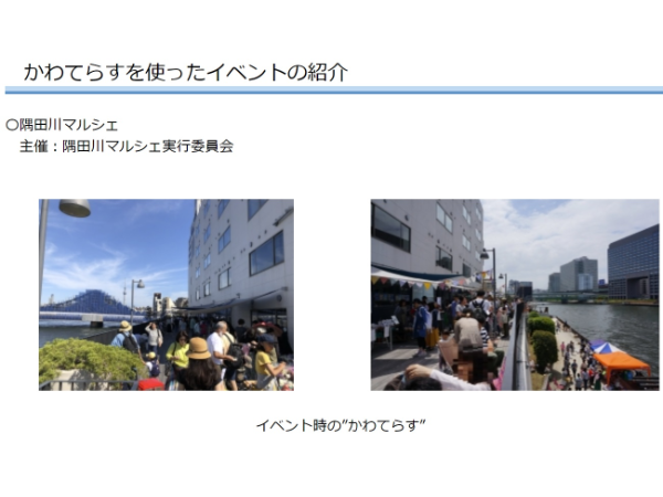 かわてらすでは、墨田川マルシェ実行委員会により、不定期にマーケットのイベントが開催されることもあるようだ。墨田川マルシェ実行委員会は、隅田川を盛り上げるボランティア団体である。