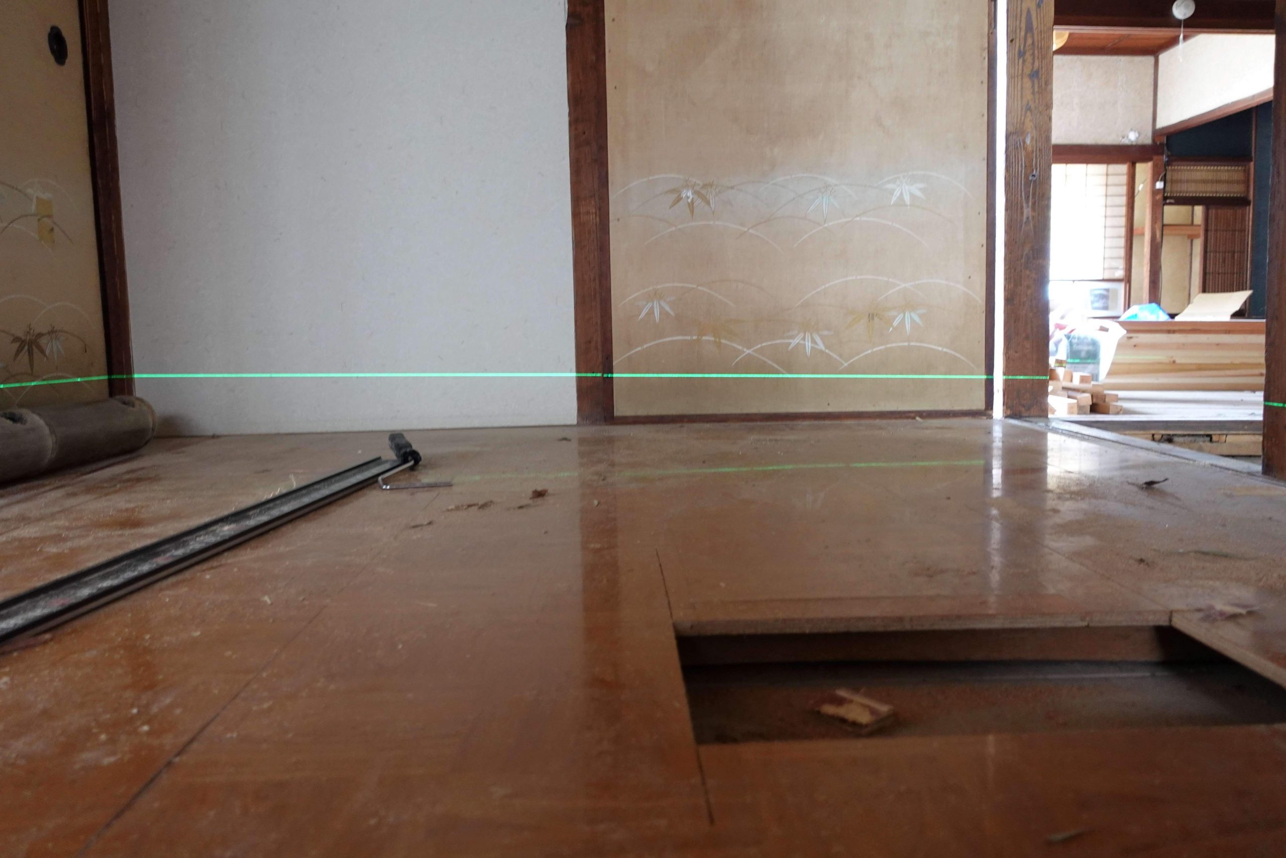 私も購入後まもなく物件を見学させてもらったが、玄関を入ってすぐの廊下が傾いていて、左手の風呂場へからだが持っていかれそうだった。この改修を専門業者に依頼すれば数百万円はかかるとみられ、確かに新規参入者にはリスクが高い。だけど、大工の四方さんならば、自分の手で直すことができる。