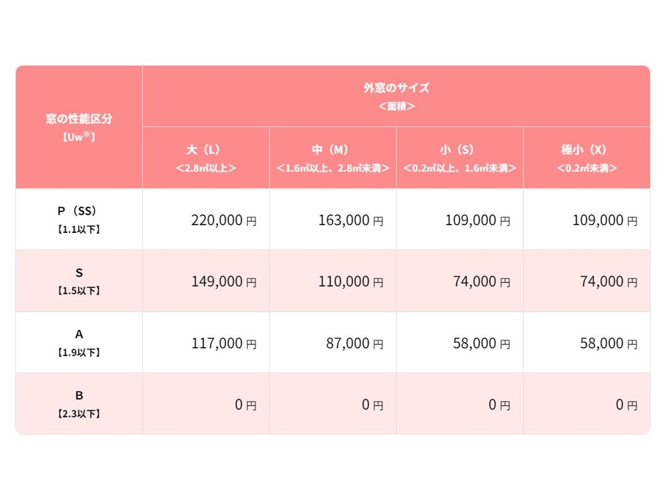 窓の性能区分がUw値1.1以下で、ガラスのサイズが2.8m2以上の場合、補助上限額は最大の22万円となる。