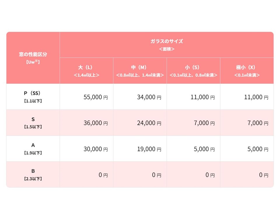 窓の性能区分がUw値(窓の熱の伝わりやすさを表す数値)が1.1以下で、ガラスのサイズが1.4m2以上の場合、補助上限額は最大の5万5,000円となる。