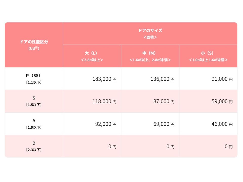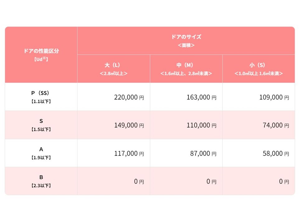 ドアの性能区分がUd値1.1以下で、ドアのサイズが2.8m2以上の場合、補助上限額は最大の18万3,000円となる。
