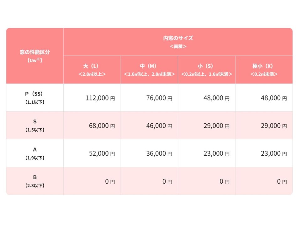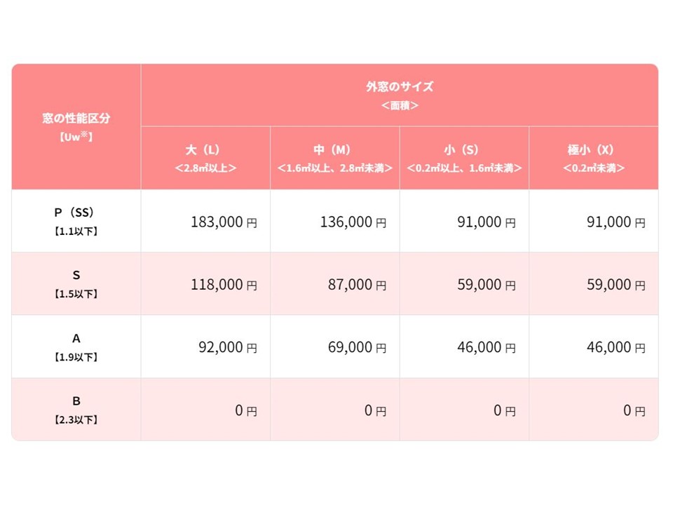 窓の性能区分がUw値1.1以下で、ガラスのサイズが2.8m2以上の場合、補助上限額は最大の18万3,000円となる。