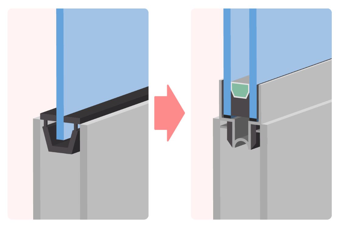 先進的窓リノベ2024事業における「ガラス交換」とは、既存窓のガラスのみを取り外し、既存サッシをそのまま利用して複層ガラス等に交換する工事のこと。交換するガラスが同じであっても、既存サッシとの組み合わせによって窓の性能に差が生じるので、性能区分と補助額が下の図のように異なる。なお、屋外から施錠できるドアのガラスのみの交換は対象とならない。