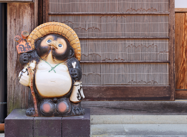 信楽焼のたぬきは、商売繁盛の守り神だ。これは「たぬき」が「他を抜く」に通じるためで、信楽焼のたぬきは、「不意の災難から守ってくれる笠」「お客様への笑顔」「周囲をよく観察する大きな目」「冷静さと大胆さの象徴である大きなお腹」「徳に通じる徳利」「信用を象徴する通い帳」「良い終わりを象徴する太い尻尾」「金運を呼ぶ金袋(陰嚢)」の8つの縁起を持っており、これを「八相縁起」と呼ぶ。