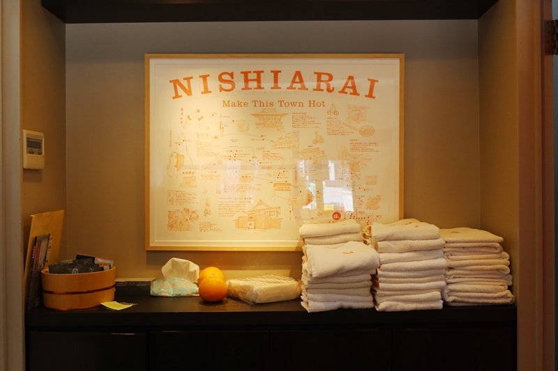 地域との関わりとしてリニューアルに当たっては2つの取組みが行われた。ひとつは地元マップの作製。西新井駅のお隣には正月に多くの人が集まる西新井大師があり、江戸時代からの面影を残す参道、レトロな雰囲気の店などが残されている。西新井ものんびりした雰囲気の商店街があるまちである。それらを堀田湯の暖簾と同じオレンジ色でまとめたマップを作成。配布している。Web上からもダウンロードすることができるようになっているので、湯に入りに行くついでにプリントアウトしておくと西新井が2倍楽しめる。
