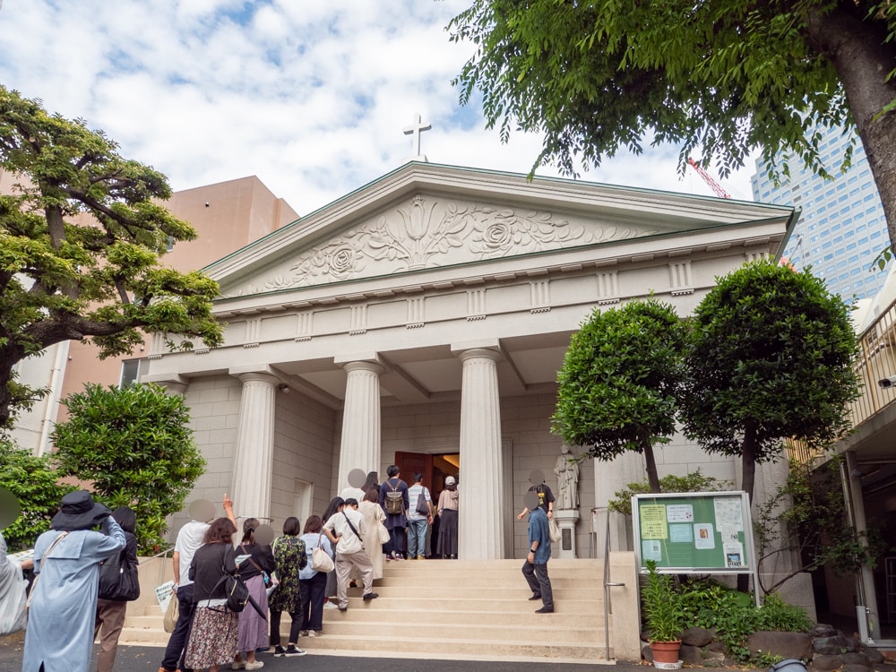 カトリック築地教会は、東京最古のカトリック教会だ。かつて築地が外国人居留地だったことから、1874年(明治7年)にこの地へ教会が建てられた。築地教会の聖堂は東京都景観条例の歴史的建造物に選定されており、中央区の区民文化財に指定されている。聖堂の外観は、まるでギリシャのパルテノン神殿のような壮大な雰囲気。正面に建ち並ぶ柱は迫力があり、印象的だ。