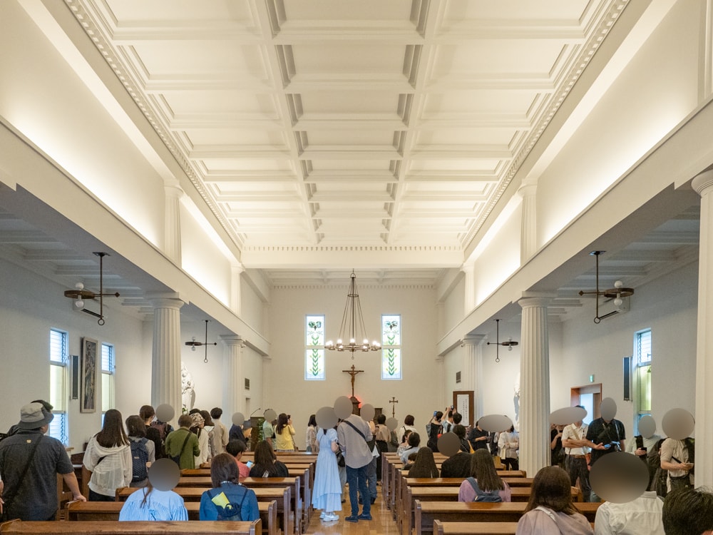 聖堂の内部は天井が高く開放感のある広々とした空間で、教会らしい厳かで神聖な雰囲気。左右の壁に並んだステンドグラスから差し込む光が美しく、神秘的な印象を感じる。また入口の門の横には「江戸のジャンヌ・ルイーズ」と呼ばれる鐘が展示されている。1876年(明治9年)にフランスで鋳造された銅製洋鐘である。