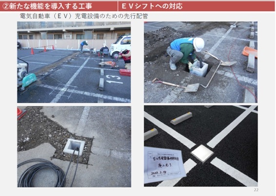 「安心して暮らしやすいために」というテーマについては、電力需要の削減に向けた工事やバリアフリー工事のほか、駐車場区画には電気自動車の充電設備を設置。ほかの駐車区画にも今後いつでも充電設備が設置できるよう、先行配管工事も行った。ほかに防災対策として、浸水による電源喪失リスク防止対策の実施、防災倉庫への改修などを行っている。