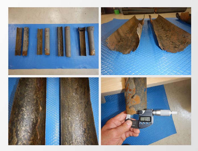 管材は軽量鋳鉄管で、黒鉛腐食で劣化・減肉していったものと考えていたとのこと。通常、鋳鉄管は4.5mm厚だが、抜管調査で肉厚測定すると、同マンションでは3.5mmのものが採用されていたという。