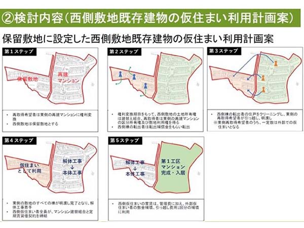 「西側棟を仮住まいとする計画は、マンションの再取得者と転出者の双方にメリットがある計画であり、合意形成がしやすいと考えました。例えば、東側棟から西側棟に移って仮住まいをする方は、同じ団地内で住環境を変えることなく再取得まで過ごすことができます。また、西側棟以外で仮住まいをする方は、仮住まいで建替組合に入る賃料収入を原資に、仮住まい支援金を受け取れるようにします。さらに転出者にとっても、西側棟で仮住まいを確保することにより転出先の候補が多くなり、より希望に近い転出先探しができるというメリットが出せます」