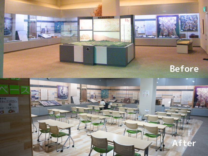 若者のアイデアから実現された事業の一つに「図書館のリノベーション」がある。「テスト期間に勉強するスペースが足りない」という意見をもとに、利用者の少なかった郷土資料室をリノベーションした。机を並べ、勉強しやすいような照明に変えるだけではなく、床を絨毯からフローリングにして飲み物可の空間にした(こぼしてもサッと拭けるため)。