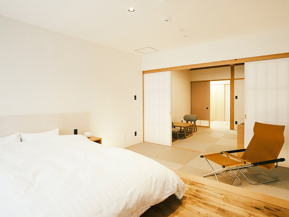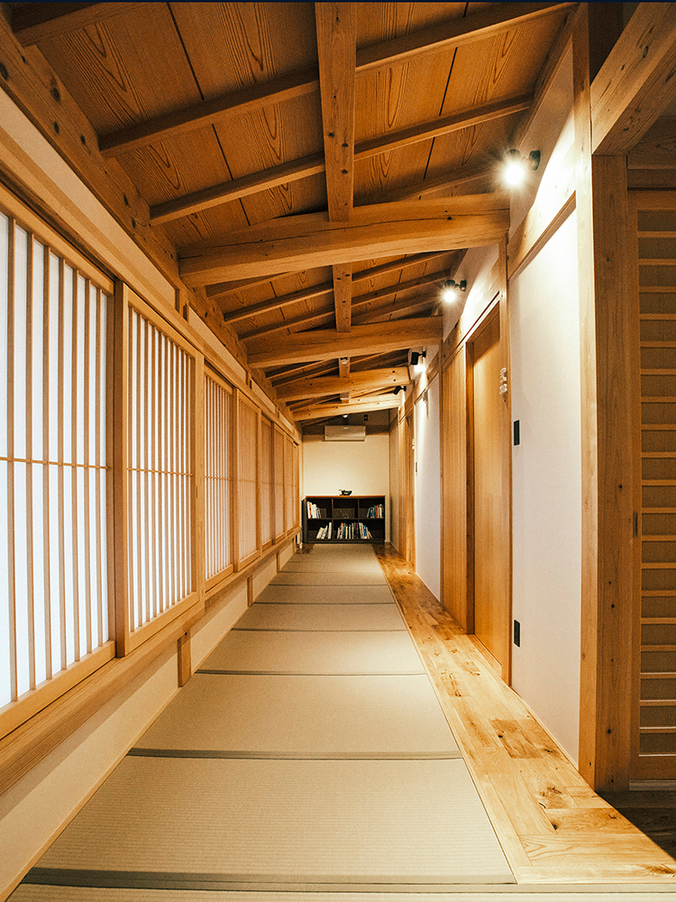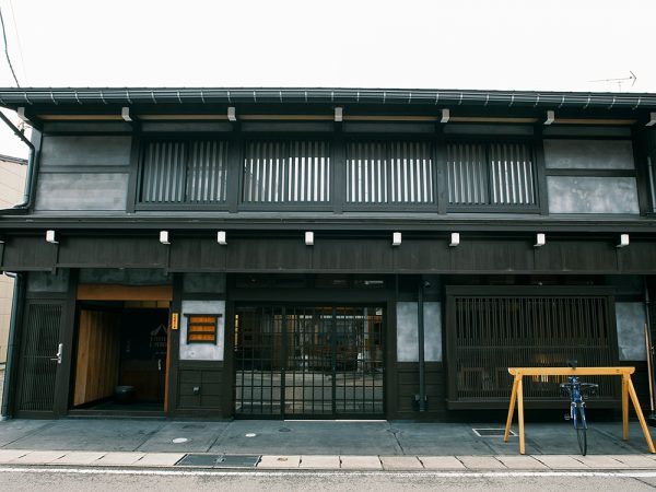 ふわりと木の香りが漂う客室は、和モダンな雰囲気が外国人観光客からも好評。布団敷きのような低いベッド、腰掛けやすい低座椅子、畳ソファなど、海外からのゲストも快適に「畳上で過ごす感覚」を味わってもらえるようにしているそう設計は、同じ町内で町家リノベーションを数多く手がけている70代のベテラン一級建築士に依頼。飛騨古川の町並みや伝統と文化を深く理解する匠は、敢えて軒高を高くせず隣家の軒高と合わせて景観に配慮。町並みに溶け込むようにすることで”新築感”が出過ぎないファサードとなっている。建物内は古民家の手法を用い、豪快な柱や厚鴨居、小屋梁を中間で支える「牛丸太」を多用するなど飛騨らしい木の存在感が漂う。また、入り口の「大戸」は近所から譲り受けた古い扉を再利用するなどもした。